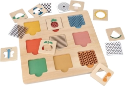 Ova drvena edukativna slagalica donosi djeci radost otkrivanja. Šareni motivi (životinje, cvijeće i drugi uzorci) pozivaju na umetanje i pomicanje dijelova, što prirodno razvija koordinaciju oka i ruke te strpljenje. Zahvaljujući robusnoj drvenoj ploči i dijelovima koji se lako hvataju, igra je intuitivna i sigurna.