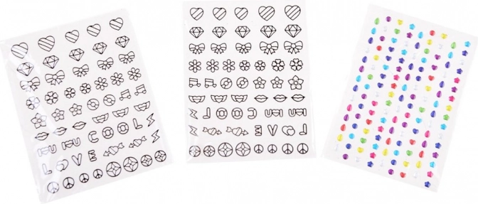 - 7× flomaster/lak s tankim vrhom i kistom, 4× šljokice, naljepnice (konture i obojene točkice), dekorativni kamenčići/naljepnice, 2× separator prstiju, turpijica u obliku srca, mini sušilo za nokte