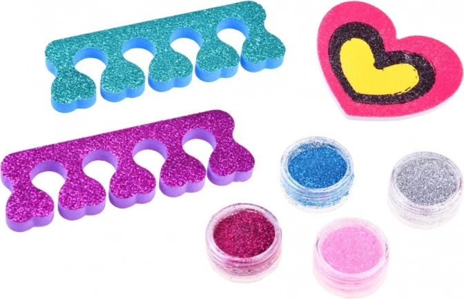 Četiri boje šljokica i naljepnice za efektno ukrašavanje upotpunjuju mekani separatori prstiju – lakiranje noktiju na nogama bit će udobno i precizno.