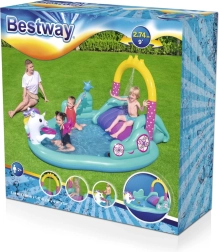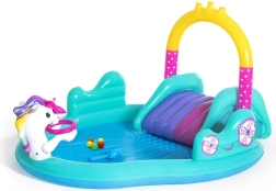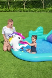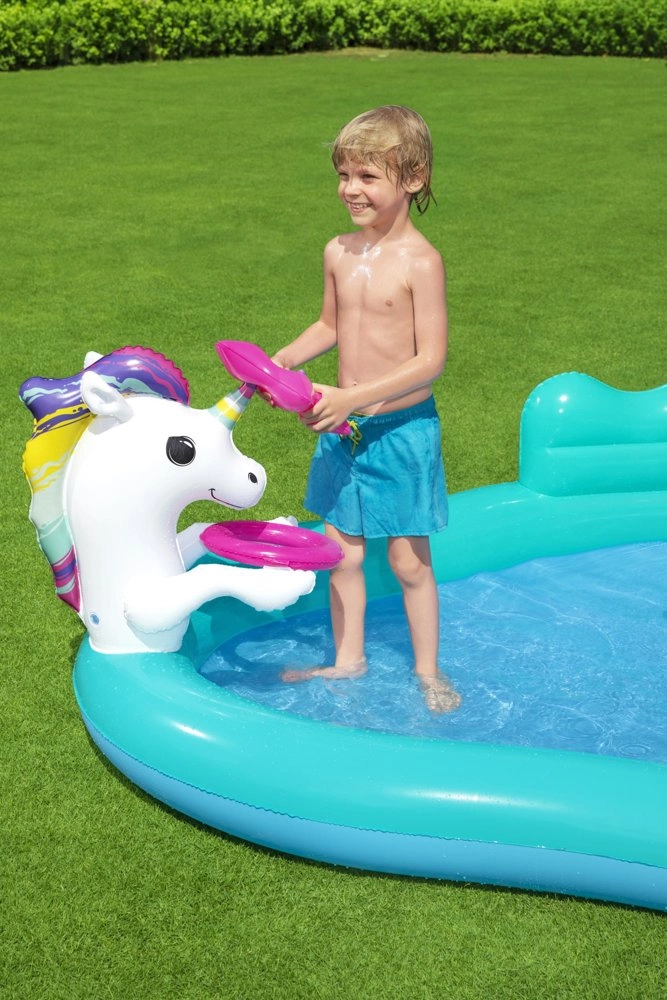 Ovo šareno nafukavajuće igralište s jednorogom pretvara vruće dane u nezaboravne vodene avanture. Dovoljno je spojiti vrtno crijevo na luk i nastaje nježan vodeni tuš koji ugodno hladi djecu. Prostrani bazen zapremine 220 litara idealan je za male ljubitelje vode, a zahvaljujući čvrstoj PVC konstrukciji lako podnosi razigranu dječju igru.
