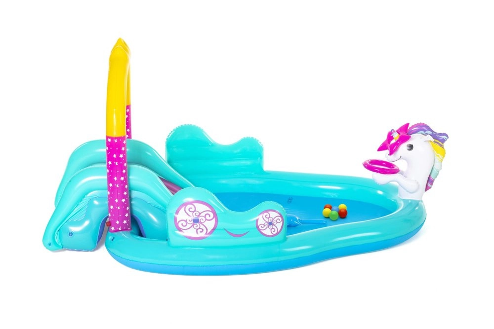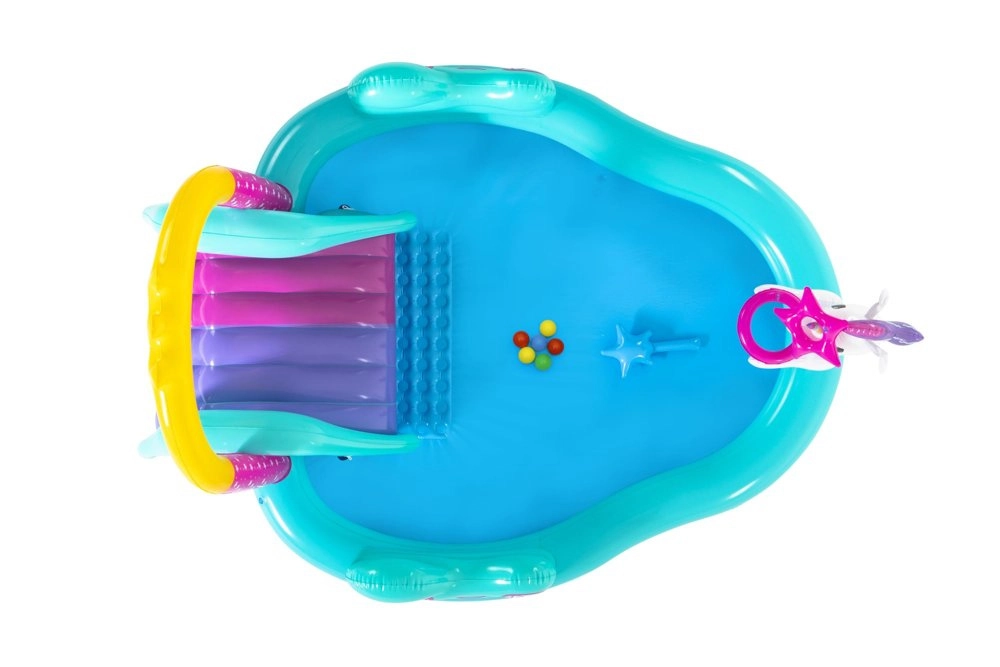 Pretvorite vrt u vodeni centar zabave za djecu! Nafukavajuće igralište s motivom jednoroga nudi bazen kapaciteta 220 l, prskajući lučni tuš nakon spajanja crijeva i široki tobogan za dvostruku dozu radosti. Izdržljiv PVC materijal, praktično brzo ispuštanje i bogata oprema osiguravaju dugačke sate sigurne zabave.