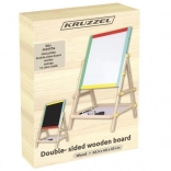 Kreativna i sigurna obostrana ploča 2-u-1 za male umjetnike – s jedne strane kredna, s druge suho brisiva i magnetska. Zahvaljujući rotacijskom mehanizmu, čvrstoj drvenoj konstrukciji i polici za pribor potiče maštu, učenje i finu motoriku. U pakiranju je sve potrebno za trenutnu zabavu: kreda, marker i spužvica.