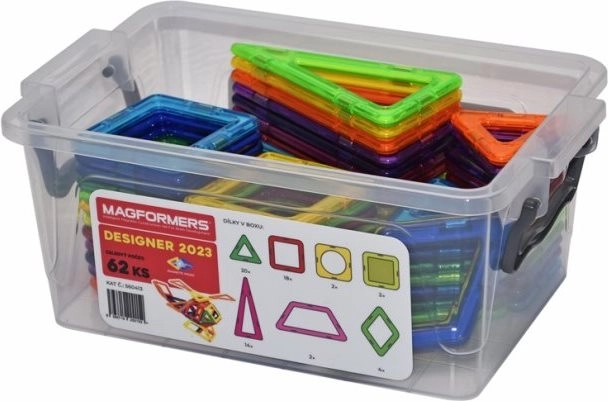 Magformers Designer 2023 dolazi s raznolikom paletom geometrijskih oblika, uključujući trokute, kvadrate i rombove. Ovaj set podržava modeliranje ne samo životinja i predmeta svakodnevne upotrebe, već i apstraktnih objekata, što svaki sastavljeni model čini jedinstvenim. Pakiranje sadrži: