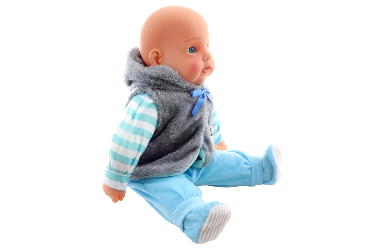 Ova velika lutka – beba dječak – dizajnirana je za autentičnu igru brige. Meko tjelešce poziva na maženje, dok plastična glavica i krajevi udova daju lutki realističan izgled. Zahvaljujući prugastoj majici, plavim hlačama i mekanom prsluku djeluje kao prava beba koju djeca rado odijevaju i njeguju.