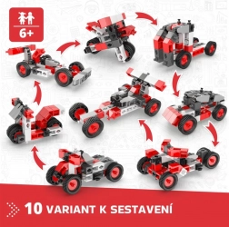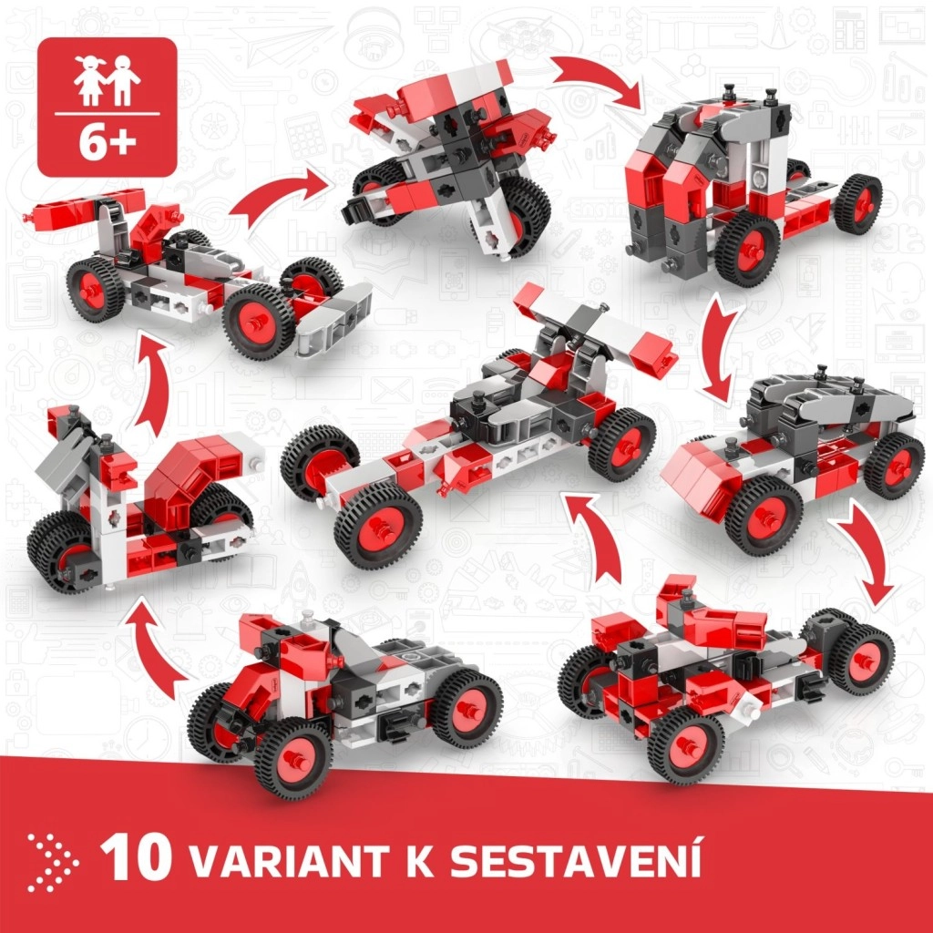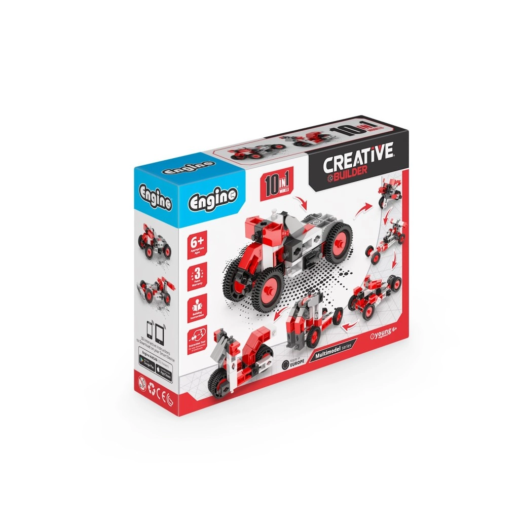 Ovaj ENGino Creative Builder set donosi djeci svijet tehnike i mašte u jednom. Od čvrstih plastičnih dijelova u crveno–bijelo–sivoj kombinaciji slažu se motori, buggyji i mala vozila, a zahvaljujući promišljenom sustavu kotača i spojeva u trenu se preuređuju u drugi model. Jedna kutija, 10 modela i bezbroj sati zabave.