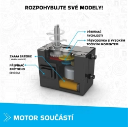 Integrirani motor s mjenjačem omogućuje promjenu smjera i brzine. Djeca će praktično isprobati mehaniku i funkcioniranje prijenosa.