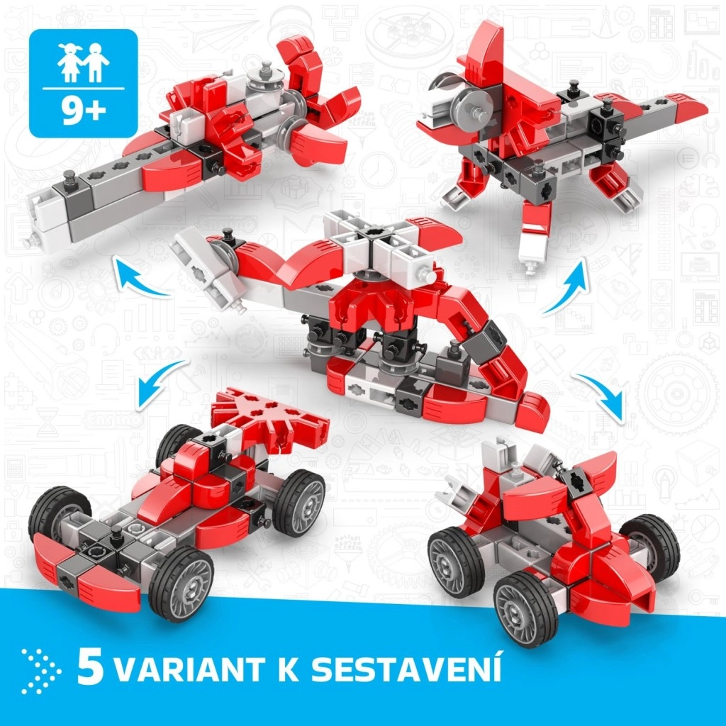 Otkrijte kreativni građevni set Engino za male i napredne graditelje. Iz jednog seta lako ćete sastaviti čak 5 različitih modela – od formule i auta do helikoptera, svemirskog stroja ili dinosaurusa. Uz interaktivnu aplikaciju Engino kidCAD modele pregledavate u 3D, rotirate ih i prilagođavate. Set je kompatibilan s ostalim Engino setovima, potiče kreativnost, finu motoriku i prikladan je od 9 godina. Proizvedeno u EU (Kipar).