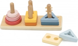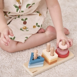 Drveni dijelovi i kolčići uče prepoznavati oblike i boje, potiču prostorno razmišljanje i logičko sortiranje. Idealno za prve korake u geometriji.