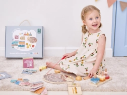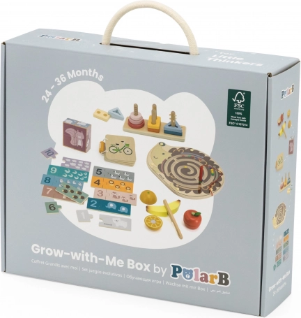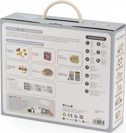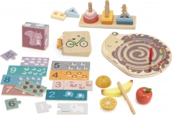Dio pakiranja su magnetični ježić labirint, slagalice i puzzle, set voća za rezanje te drvena knjižica s prometnim sredstvima. Sve je smješteno u praktičnom boxu s ručkom za lako prenošenje. Idealno za male istraživače spremne za naprednije zadatke.