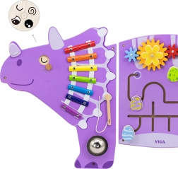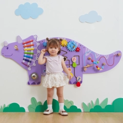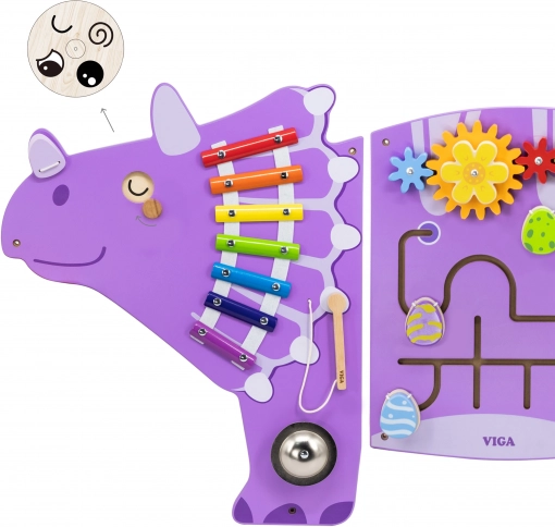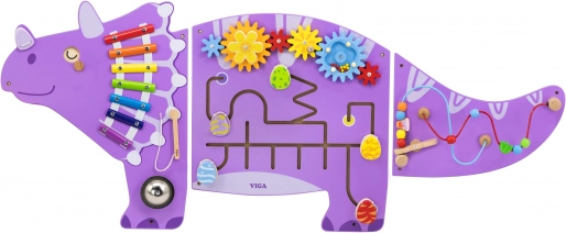 Šarena drvena zidna ploča u obliku triceratopsa brenda VIGA TOYS nudi mnoštvo aktivnosti za razvoj djece. Sadrži ksilofon s batićem i zvono/gong, okretne zupčanike, labirint s 5 otvarajućih jajeta (zrcalce + mali dinosauri), mijenjajuće oči pomoću gumba i zanimljivu pettlu motoričkih vještina s izbacivačem perlica. Odlična za finu motoriku, koordinaciju oko–ruka i senzorno istraživanje.