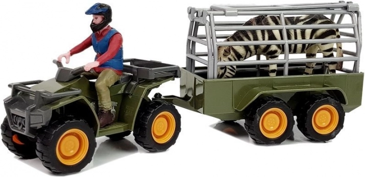 Robusna terenska kvadricikla u zelenoj boji s prikolicom koja se može odvojiti. Stražnja vrata se otvaraju pa životinje možete lako ukrcati i iskrcati – idealno za igru prijevoza životinja.