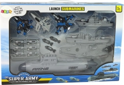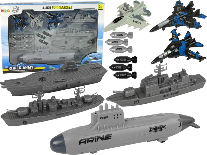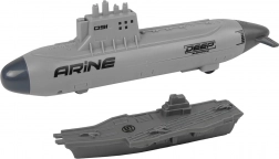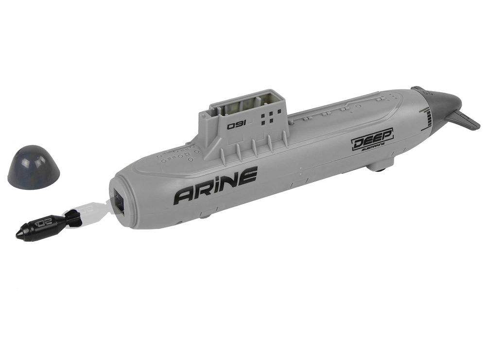 Dominantna je podmornica s mehaničkim izbacivačem i kotačićima za glatko kretanje po podu. Odozgo umetnete projektil, povučete stražnji dio i ispalite – sigurne plastične “bombe” dodaju igri akcijski element. Flotu nadopunjuju ratni brod, opskrbni brod i nosač zrakoplova, dok tri lovačka zrakoplova pružaju zračnu potporu za svaku misiju.