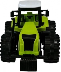 Zeleni traktor s bijelim krovom i velikim kotačima savladava svaki “poljski” zadatak. Savršena osnova za priključivanje dodatnih nadogradnji.