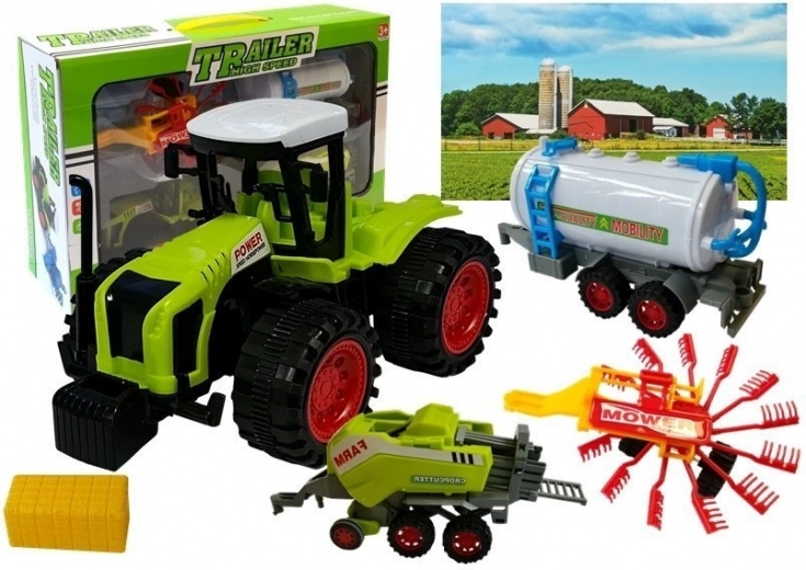 Farmerski set vozila s traktorom, cisternom, sakupljačem sijena i balirkom