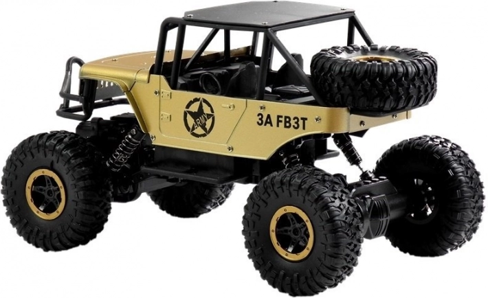 Zlatni RC Jeep 1:18 s pogonom 4x4, amortizerima i funkcijom Twist. Punjivi akumulatori, 2,4 GHz upravljač. Sjajna zabava za djecu od 3 godine.
