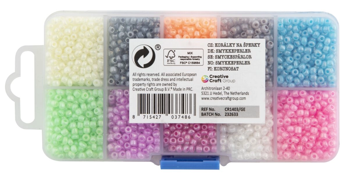 Otkrijte prekrasan set perlica s 10 različitih boja, savršeno raspoređenih u praktičnom plastičnom organizatoru.