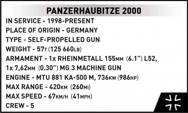 Panzerhaubitze 2000 odlikuje se visokom brzinom paljbe, velikim dometom i naprednim sustavom upravljanja paljbom, što je čini neprocjenjivom u modernim vojnim operacijama. Ovaj model je vjerna replika stvarnog vozila koje služi u mnogim vojskama diljem svijeta, uključujući Bundeswehr od 1998. godine.