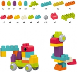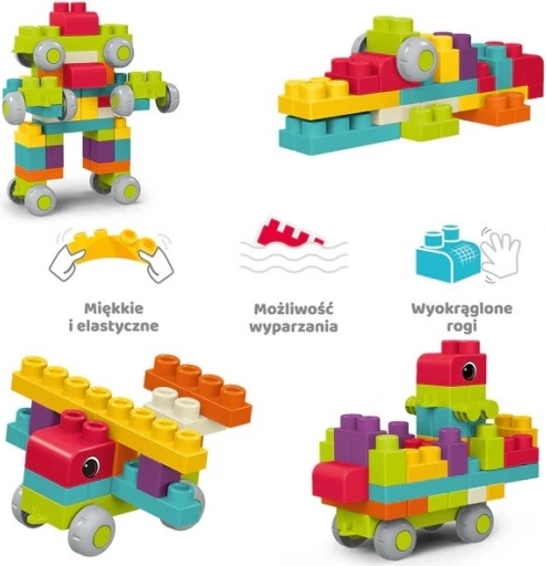 Meke i sigurne konstrukcijske kocke za najmlađe od 6 mjeseci. Set sadrži 62 dijela uključujući 10 kotačića za izradu vozila. Mekani materijal, zaobljeni rubovi i mogućnost prokuhavanja radi higijene potiču razvoj motorike, kreativnosti i prostorne mašte.
