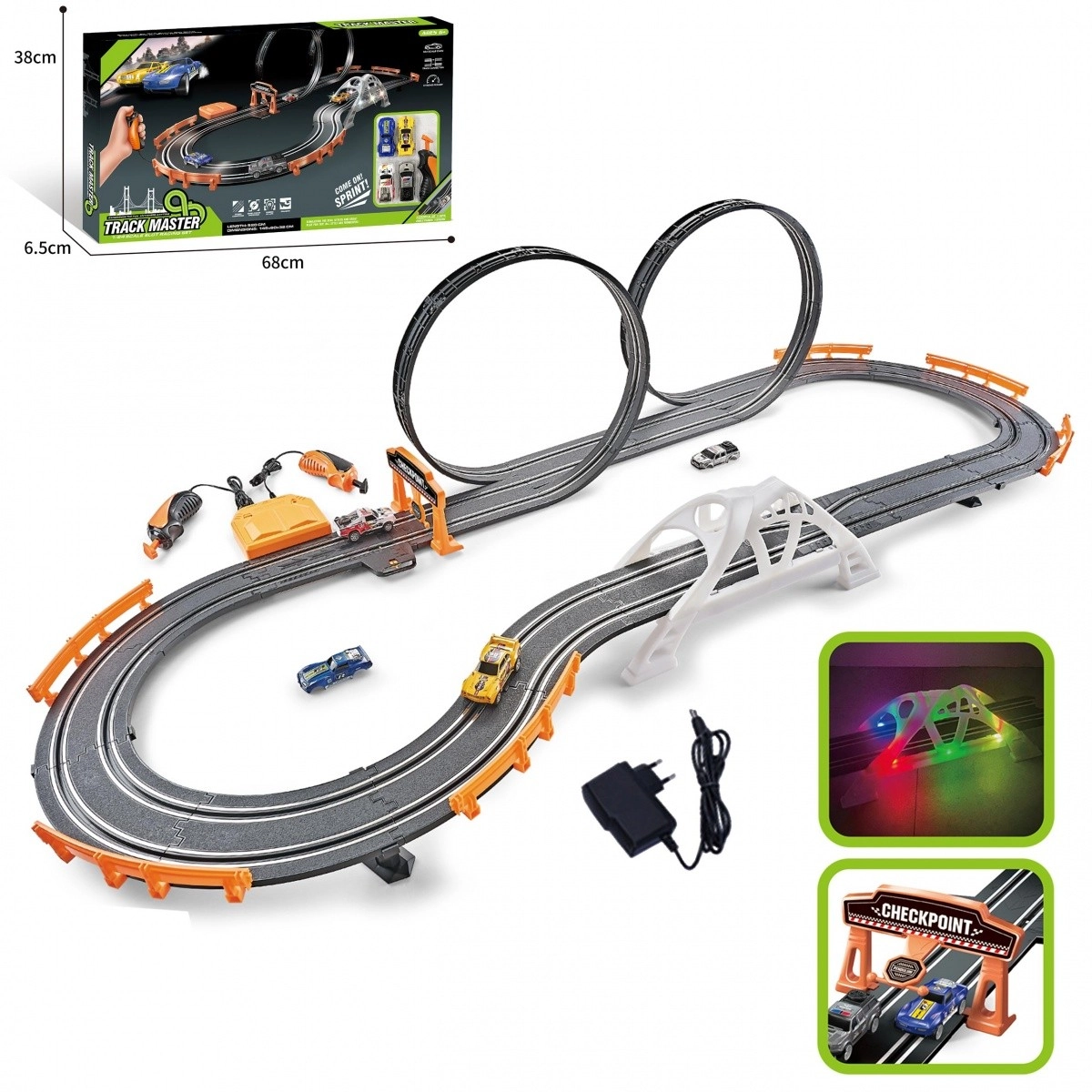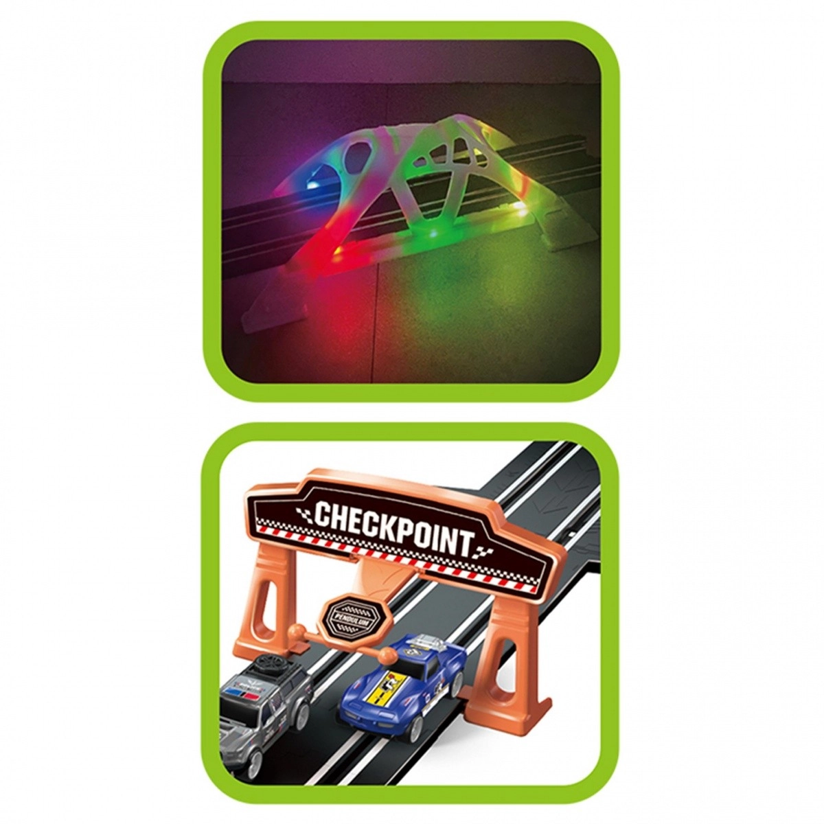Trkaća staza izrađena je u mjerilu 1:64, što je čini idealnim izborom za interaktivnu zabavu djece.