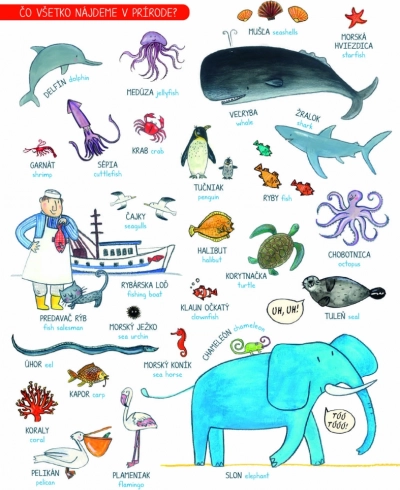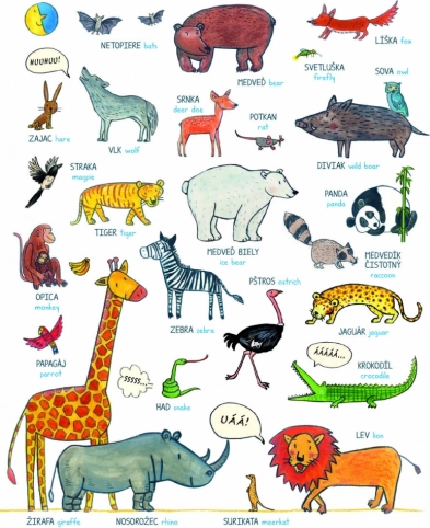 Sadržaj je osmišljen tako da raste s djetetom: najmlađi vježbaju boje i pojmove, starija djeca savladavaju prvo čitanje i pisanje tiskanim slovima. Uključene su i ideje za igre za trening kratkoročne memorije i pripovijedanje priča prema slikama – mašti nema granica. Bonus predstavljaju engleski prijevodi riječi, tako da učenje može pokračovat i na stranom jeziku. Riječ je o slovačkom izdanju knjige.