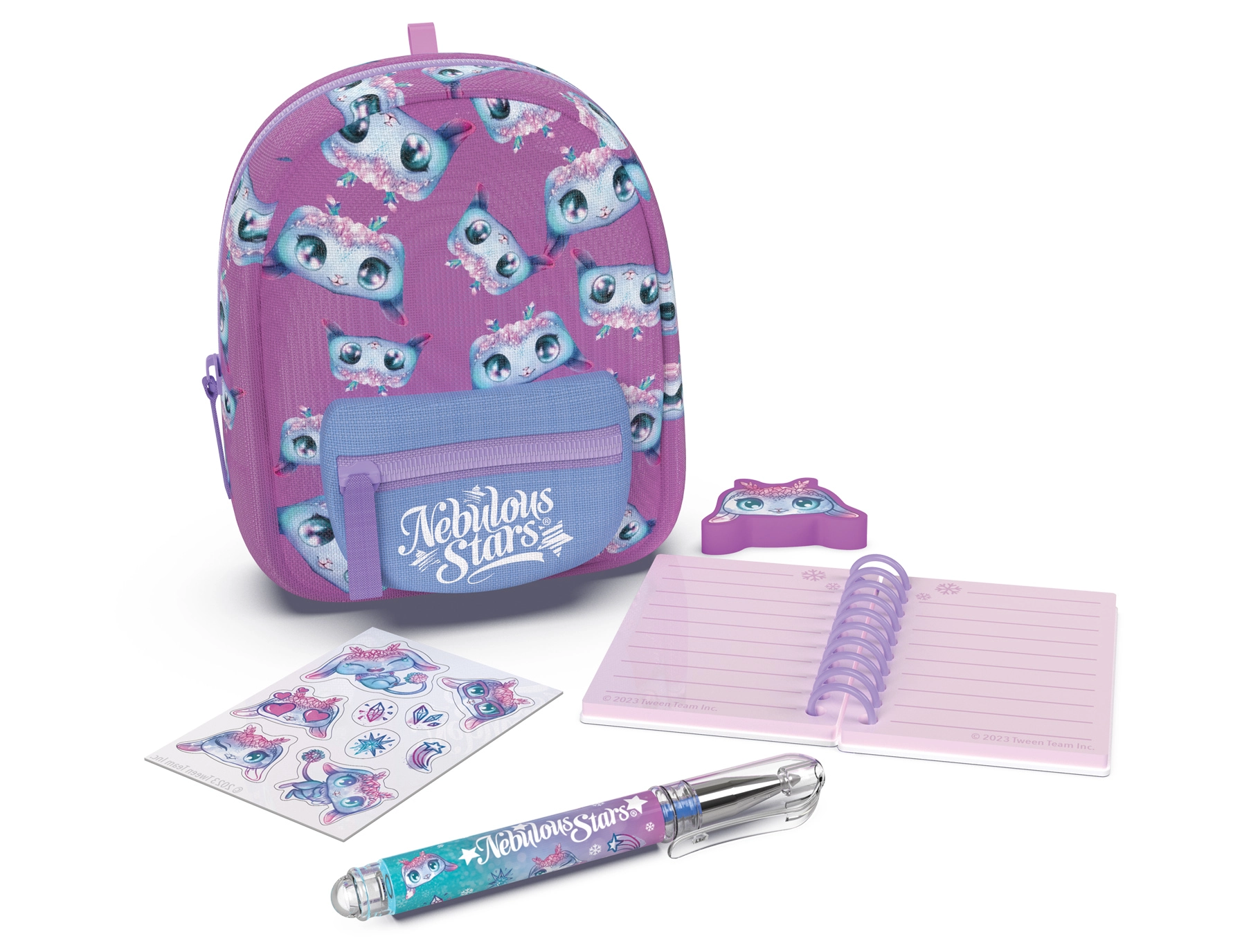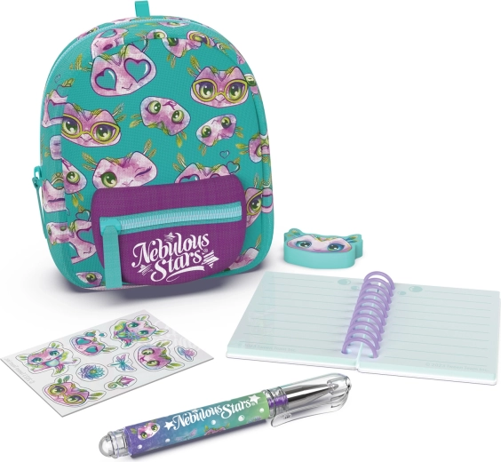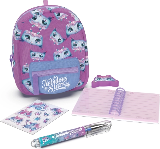 Stilni mini ruksak NEBULOUS STARS sa setom za papiru idealan je za male ljubitelje stvaranja i za putovanja. U kompaktnim dimenzijama 9 × 6 × 11 cm skriva sve potrebno: crtovanu bilježnicu, kemijsku olovku, gumicu, naljepnice i slatki privjesak. Dostupne su 3 varijante boja – plava, bijela i ljubičasta.