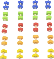 Set uključuje 40 dijelova, sastavljenih od 20 parova vijaka i matica u 5 živopisnih boja i oblika, te također praktičnu pamučnu torbu za lako skladištenje.