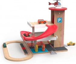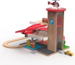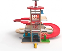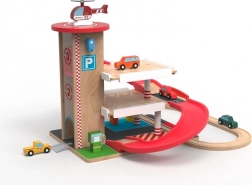 Ova kvalitetna drvena garaža s vlakotragom nudi tri kata parkiranja, funkcionalni lift s ručnim pogonom i heliport na krovu. Djeca mogu natočiti gorivo na pumpama u prizemlju, podići autić liftom i spustiti ga niz crvenu spiralnu rampu natrag dolje, gdje se glatko nastavlja vožnja po tračnicama. Izdržljivi materijali i promišljeni detalji jamče dug vijek trajanja i sigurnu igru.