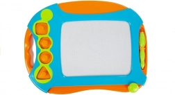 Set uključuje veliku ploču s praktičnom ručkom, magnetsku olovku i četiri pečata u obliku geometrijskih likova. Izdržljiva plastična izrada, ugodne boje i promišljeni detalji čine je idealnom igračkom za dom, vrtić i putovanja.