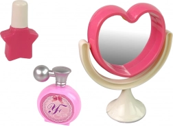 Srcoliko ogledalo na stalku, “lak” za nokte i “parfem” (imitacija) potiču maštu i podržavaju igru uloga u dječjem salonu ljepote.