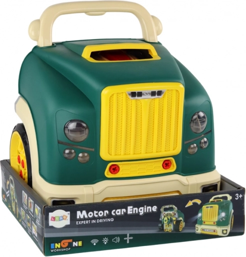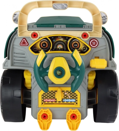 Ova dječja montažna radionica u obliku zelenog kamiona spaja igru i učenje u jednom. Djeca mogu odvrnuti kotače, otvoriti haubu i istraživati motor, vježbajući koordinaciju ruku i strpljenje. Interaktivna instrumentna ploča s volanom, trubom, tipkom start/stop, tipkom za upozorenje i prekidačem „prijenosa” donosi realističan doživljaj vožnje.
