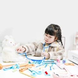 Drvena medicinska set s 43 različita elementa, idealna za male liječnike i zubare, podržava kreativnu igru i razvija vještine.
