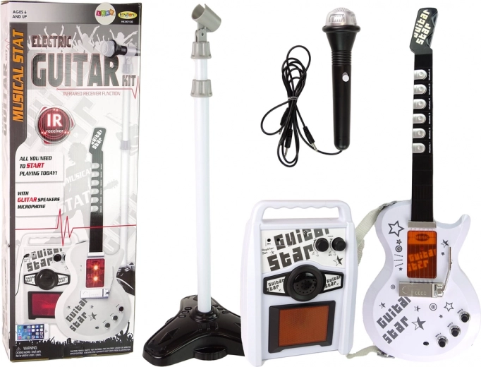 Ova električna gitara s mikrofonom je sjajna igračka za najmlađe koja ih uvodi u čarobni svijet glazbe. Gitara u bijeloj izvedbi izgleda vrlo realistično i privući će pažnju svakog djeteta. Napaja se s tri baterije, što omogućuje neometanu zabavu, a nakon uključivanja svijetli, čime dodatno povećava atraktivnost i potiče dječju maštu.