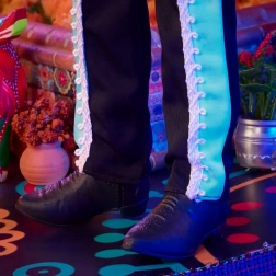 Impresionirajte izraženim vezovima šećernih lubanja, cvetova i kostiju, koji ukrašavaju odelo i dodatke kao što su remen i cipele.