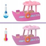 Ovaj šareni set za igru donosi djeci od 4 godine mini vodene avanture na dlanu. Brod u ružičasto-ljubičastim tonovima ima gornju palubu sa sjedenjem, kabinu i može se rasklopiti u scenu za igru s jarko žutim toboganom i tirkiznim bazenčićem u obliku srca. Dio seta je i mini lutkica u kupaćem kostimu, spremna za blagdansku plovidbu.