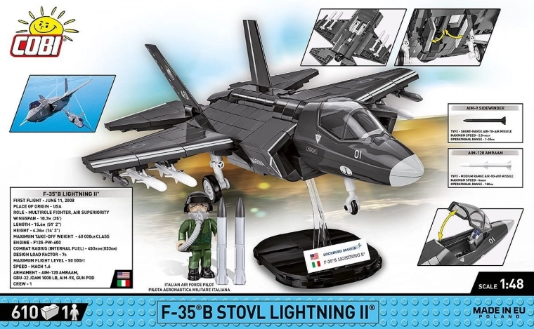 Uz ovaj set sastavit ćete višenamjenski lovački zrakoplov F-35B LIGHTNING II koji je dizajnirala tvrtka Lockheed Martin. Model u mjerilu 1:48 sadrži realističnu pilotsku kabinu koju je moguće otvoriti i u nju smjestiti figuricu pilota s kacigom i maskom za kisik. Zahvaljujući priloženom postolju, model možete odlično izložiti.