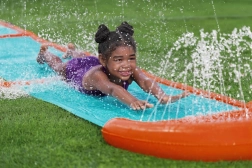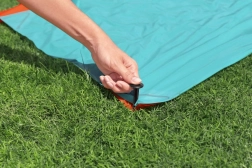 Tobogan je jednostavno instalirati – samo spojite adapter na vrtnu cijev i spremni ste za akciju. Uživajte u samostalnom klizanju ili zamijenite mjesta s prijateljima. Na rubovima tobogana nalaze se jastučići za upravljanje prskanjem vode koji omogućuju interakciju među toboganima.