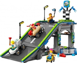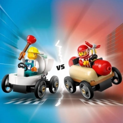 LEGO CITY set donosi visoku rampu, dva originalna trkaća autića (hot dog i toalet) i 4 minifigurice, uključujući vozače – prodavača hot dogova i vodoinstalatera. Djeca lako postave vozila na vrh rampe, pomaknu polugu i gledaju kako se automobili sjure sa starta. Odličan izbor za samostalnu i zajedničku igru.