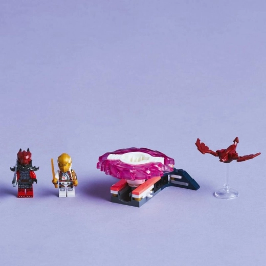 Uđite u svijet NINJAGO i ponovno proživite napete prizore iz 3. sezone serije Uspon zmajeva. Vrtuljak s okidačem donosi brzu i jednostavnu akciju – pritisnite, zavrtite, pogodite metu i gledajte kako dva elementa moći odleće. Uz aplikaciju LEGO Builder slaganje je intuitivno i zabavno za djecu i roditelje.