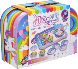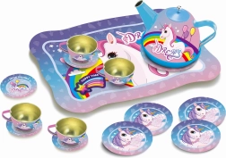 Čarobni čajni set u preslatkom koferčiću s motivom jednoroga razveselit će svaku malu domaćicu. Sadrži čajnik, 4 šalice, 4 tanjurića i 4 tanjura, sve od izdržljivog metala. Praktični koferčić s ručkom ima dimenzije 25 × 19 × 10 cm – idealno za putovanja i spremanje.