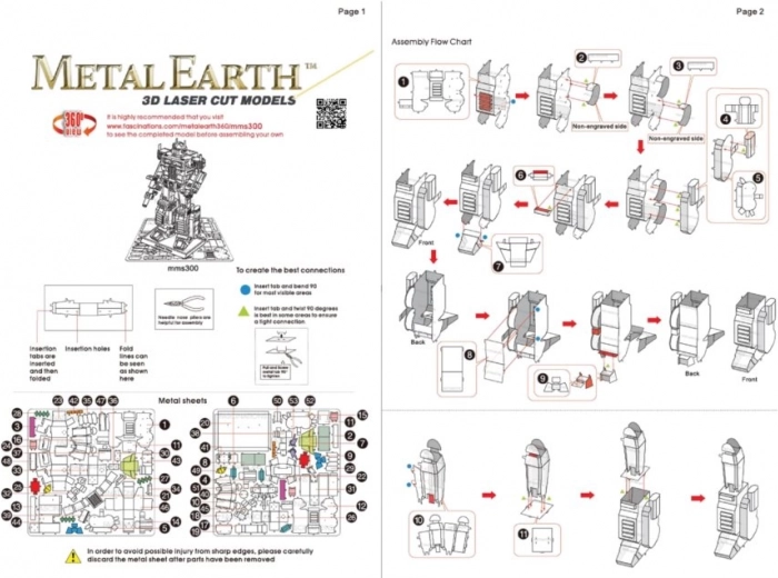 Set sadrži 2 čelične pločice (21 × 11 cm) i detaljne ilustrirane upute. Pojedini dijelovi se istiskuju iz pločica i spajaju u zasune pomoću preklopnih jezičaca – dakle bez ljepila. Za udobniji rad preporučujemo male kliješta/rezače i fine ravne kliješta (nisu uključeni). Sastavljeni model mjeri približno 9 × 4,5 × 3 cm i prikladan je od 14 godina nadalje.