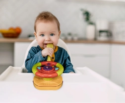 Roditelji će cijeniti univerzalno pričvršćivanje pomoću kopči i remena na većinu autosjedalica i kolica, kao i izdržljivu izradu prikladnu za svakodnevnu igru. Igračka potiče razvoj fine motorike, koordinacije oko–ruka i osjetilne percepcije.