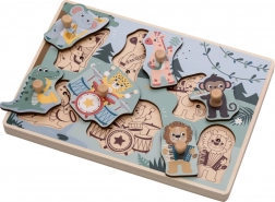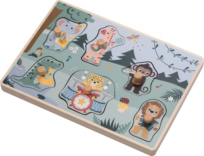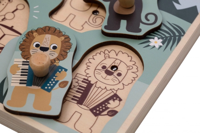 Otkrijte svijet džungle s sigurnom drvenom slagalicom koja nakon umetanja ispravnog dijela reproducira zvukove pojedinih životinja. Djeca se kroz igru uvježbavaju u prepoznavanju oblika i uče povezivati sliku sa zvukom.