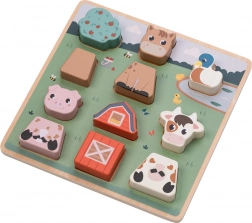 Ova drvena umetaljka na čvrstoj podlozi oduševit će sve male ljubitelje životinja. Djeca se tijekom igre uče prepoznavati oblike i boje, vježbaju strpljenje i logičko razmišljanje te pritom razvijaju finu motoriku i koordinaciju oko–ruka. Dijelove s motivima životinja lako je umetnuti u podlogu, a mogu se koristiti i samostalno u slobodnoj igri.