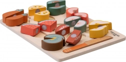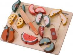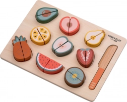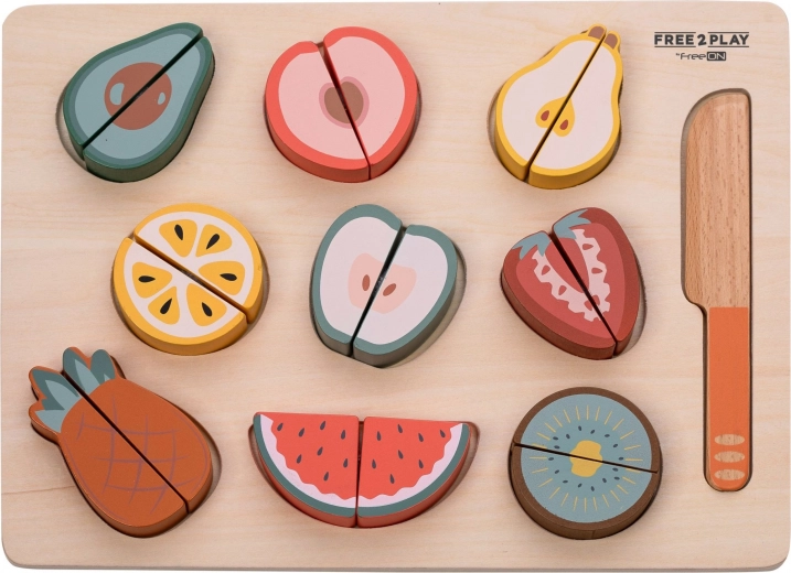 Drveni set Rezanje voća na dasci FREE2PLAY idealan je za prve kuhinjske igre. Djeca upoznaju različite vrste voća, uče oblike i boje te sigurno vježbaju „rezanje” pomoću drvenog nožića. Pojedine polovice voća drže se zajedno zahvaljujući čičku i pri razdvajanju stvaraju zadovoljavajući zvuk koji motivira na daljnju igru.