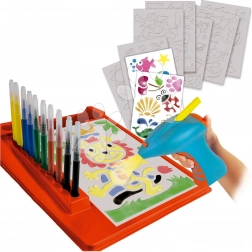 Paket sadrži sve što je djeci potrebno za stvaranje – 10 šarenih flomastera, crtački centar, praktične šablone i upute. Dovoljno je umetnuti 2 AA baterije u pištolj i kreativni show može početi!