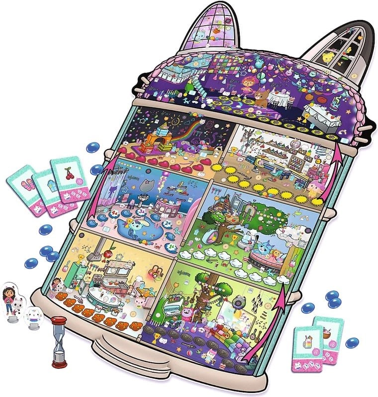 Sadržaj pakiranja: igraća ploča u obliku mačje kuće, 2 figurice s postoljima, pješčani sat, kartice s tragovima (56 kom), posebni tragovi (10 kom) i upute.