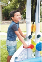 Otkrijte multifunkcionalni vodeni centar koji će svako dvorište ili dječju sobu pretvoriti u mjesto puno radosti. Djeca mogu upravljati protokom vode, napuniti posudu za prskanje, pokrenuti dvostruki slap i gledati kako se loptice kotrljaju preko vodenog/kuglarskog transportera u gornju kantu. Napuhujuća podloga povećava sigurnost i udobnost tijekom igre.