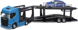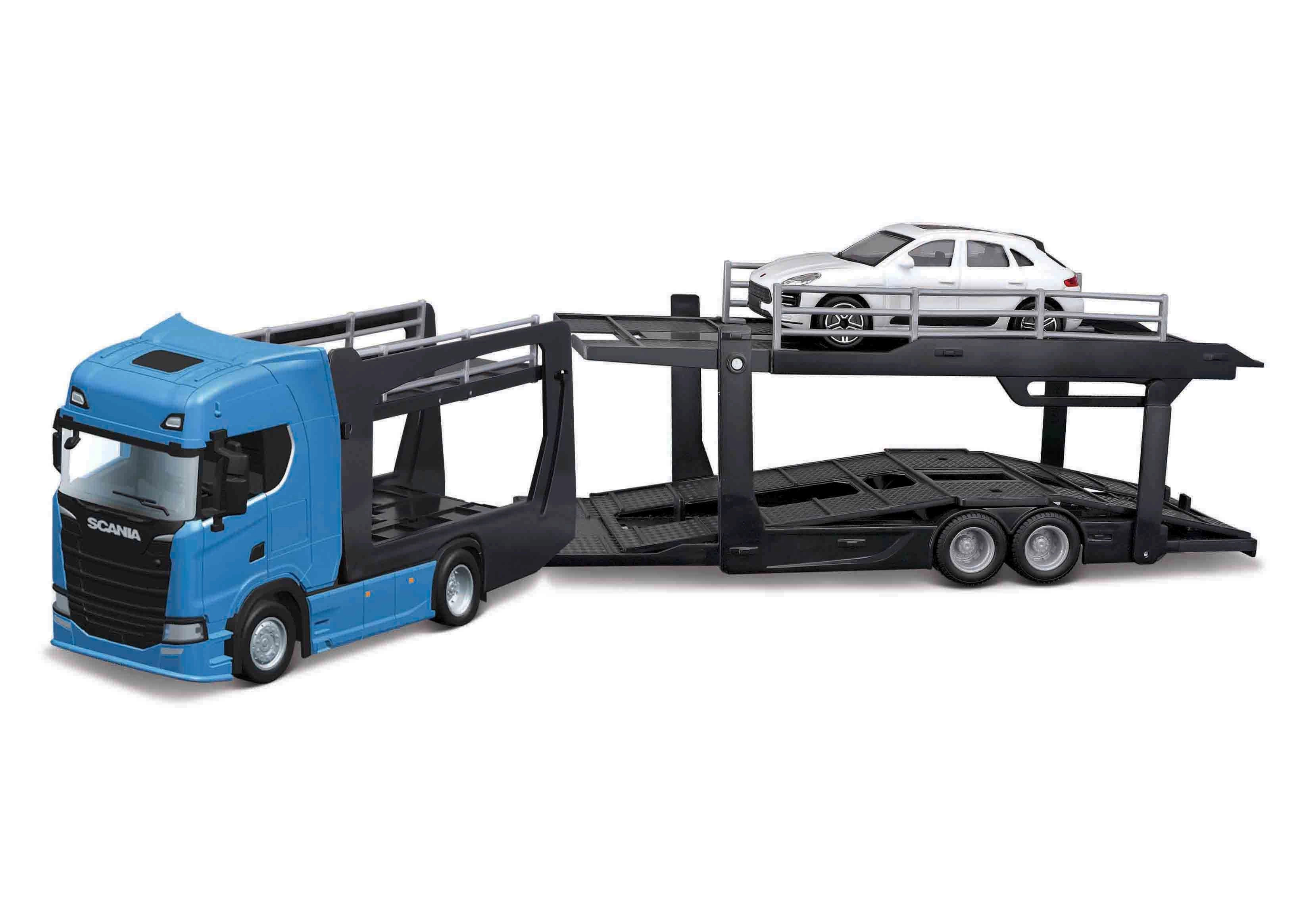 Višekatna prikolica s bočnom ogradom i pristupnim rampama omogućuje lako ukrcavanje i prijevoz malih autića – baš kao u stvarnosti.