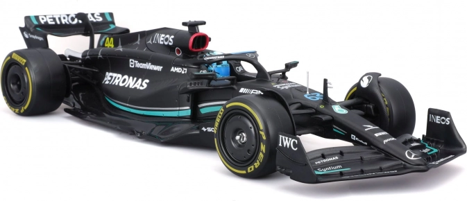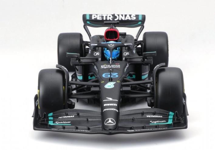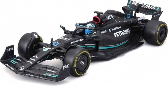Vjerno reproducirani oblici, lak i sponzorski logotipi MERCEDES‑AMG PETRONAS F1 W14 (2023) sa startnim brojem 63 za Georgea Russella.