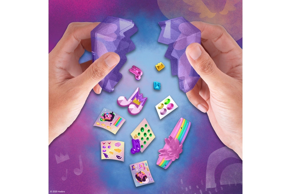 Dio pakiranja su listovi naljepnica i privjesci za personalizaciju ponija i njegovih dodataka. Tu su i moderna narukvica prijateljstva i privremene tetovaže koje šire zabavu i izvan igre. Sjajan izbor za obožavatelje MY LITTLE PONY i za kreativnu djecu od 5 godina.